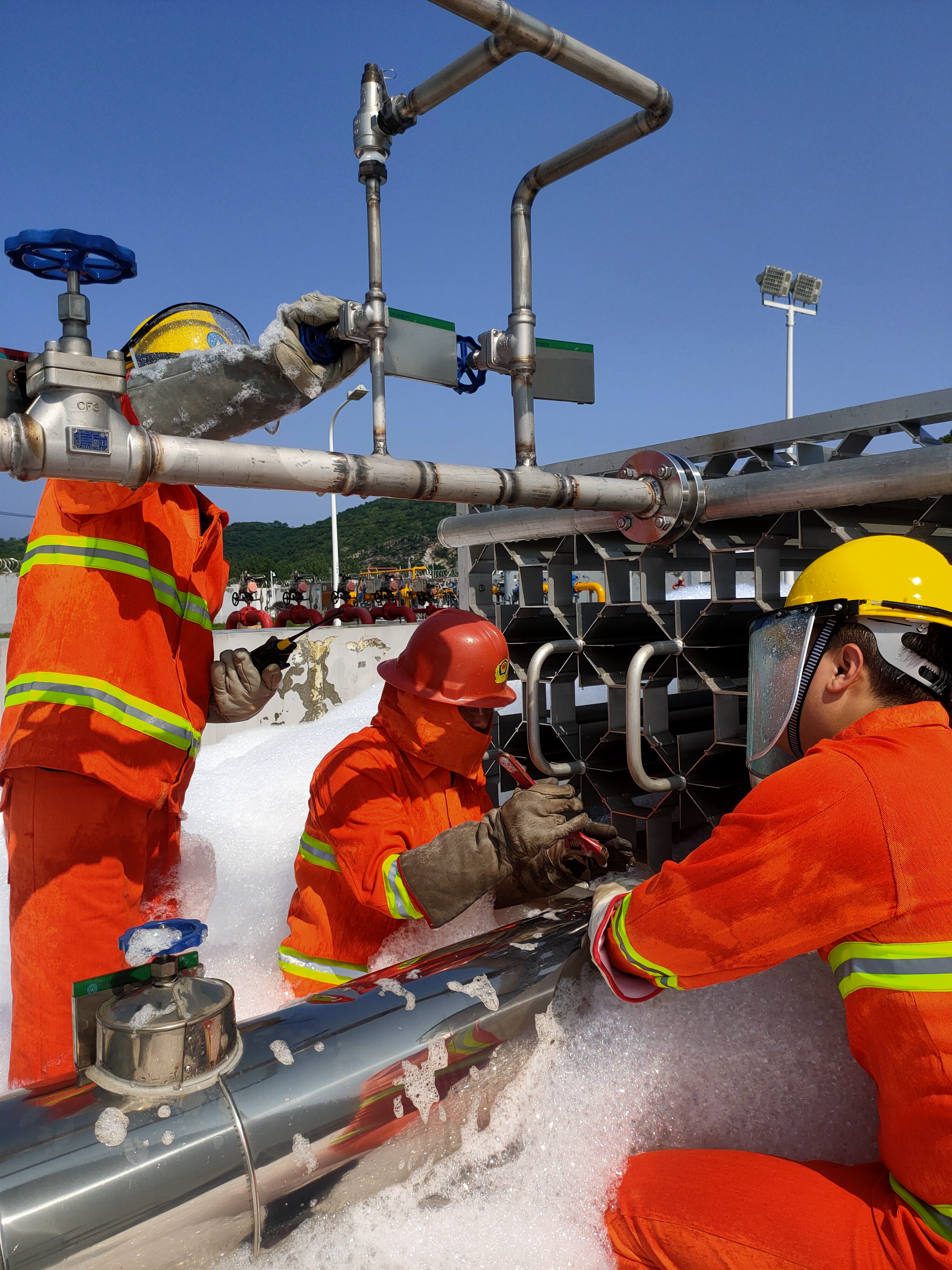 演練模擬了LNG站在氣化作業(yè)時(shí)出現(xiàn)儲罐增壓撬進(jìn)液法蘭泄漏,罐區(qū)低溫探測器報(bào)警,聯(lián)動啟動泡沫發(fā)生器,泡沫迅速覆蓋泄漏區(qū)域。站控室值守人員迅速上報(bào)并立刻按下PLC的ESD緊急按鍵切斷所有氣動閥門,安保人員拉起警戒線負(fù)責(zé)警戒。在確認(rèn)現(xiàn)場情況和泄漏位置后,搶險(xiǎn)人員迅速穿戴搶險(xiǎn)裝備前往泄漏點(diǎn)開展緊急搶險(xiǎn)維修。演練歷時(shí)30分鐘,整個(gè)過程緊張有序、分工明確、處置得當(dāng)。