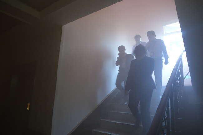 下午15:30分,隨著警報響起,各樓層疏散組長迅速行動,及時引導(dǎo)各層員工沿逃生疏散路線有序撤離。全體員工依照預(yù)案要求,用濕毛巾捂住口鼻快速前進,僅用了5分鐘即安全撤離到公司大樓警戒線外的安全地帶。隨即,各樓層疏散組長清點人數(shù)后向演練總指揮報告疏散情況,整個應(yīng)急疏散過程,秩序良好,反應(yīng)迅速。
