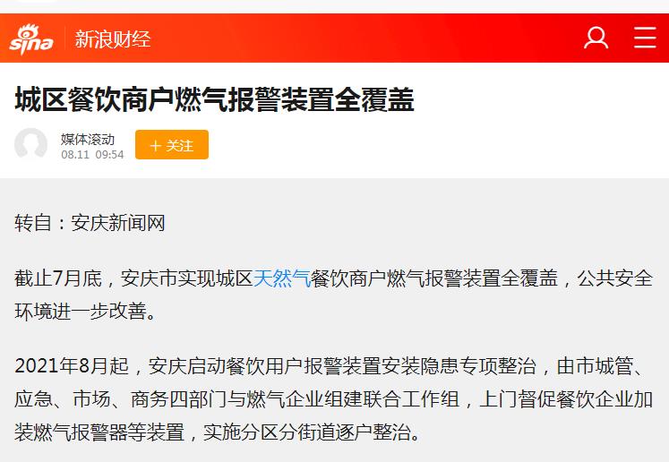 城區(qū)餐飲商戶燃?xì)鈭缶b置全覆蓋(轉(zhuǎn)載于新浪財經(jīng))