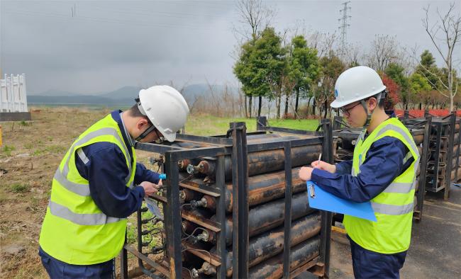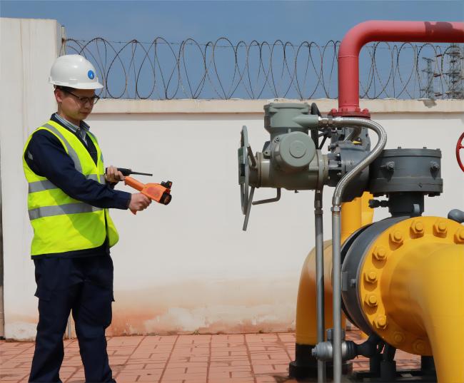 12時(shí)08分,置換作業(yè)開(kāi)始。確定管道內(nèi)氣體成分比例符合要求后,置換組緩慢開(kāi)啟1號(hào)閥門(mén),向管網(wǎng)內(nèi)輸送天然氣,并由調(diào)度中心對(duì)管網(wǎng)內(nèi)壓力情況跟進(jìn)、監(jiān)測(cè)。正午時(shí)分,驕陽(yáng)似火,檢測(cè)人員們一邊吃著盒飯一邊堅(jiān)守施工現(xiàn)場(chǎng)觀測(cè)數(shù)據(jù)。終于,14時(shí)16分,現(xiàn)場(chǎng)調(diào)度的對(duì)講機(jī)內(nèi)傳來(lái)放散塔檢測(cè)人員的聲音:“經(jīng)檢測(cè),管網(wǎng)內(nèi)燃?xì)夂恳堰_(dá)99.7%,置換合格。”