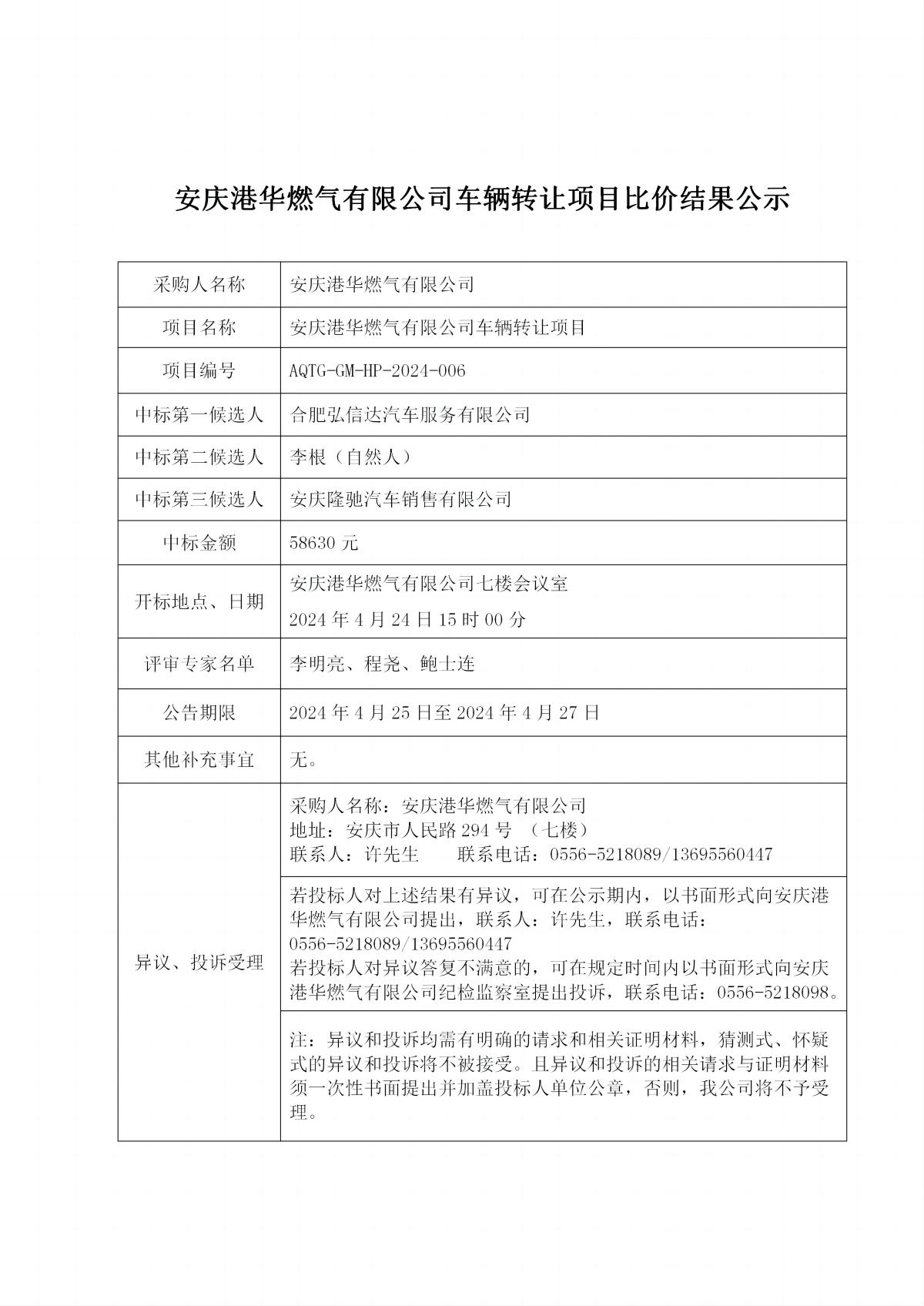 安慶港華燃氣有限公司車輛轉讓項目比價結果公示