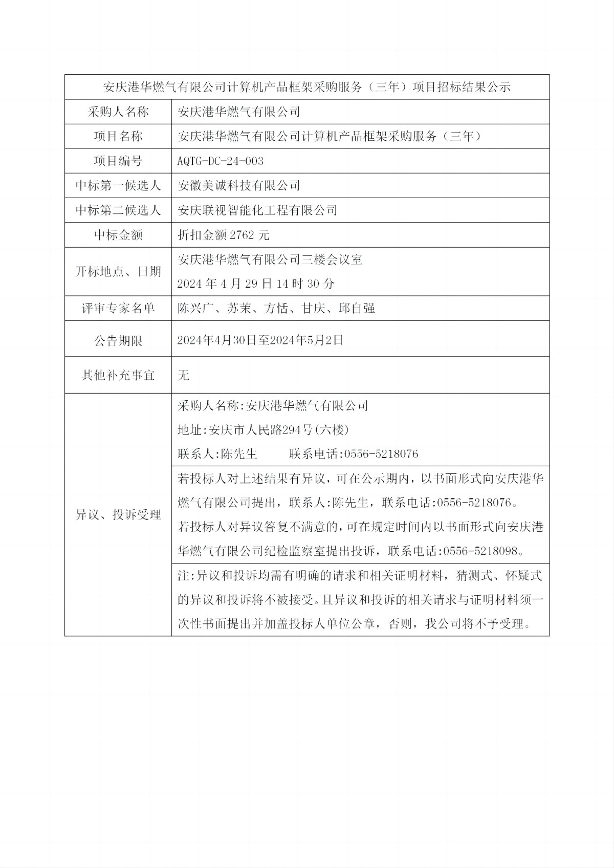 安慶港華燃?xì)庥邢薰居嬎銠C(jī)產(chǎn)品框架采購服務(wù)(三年)項目招標(biāo)結(jié)果公示 發(fā)布時間:2024-04-30    閱讀次數(shù):3563次