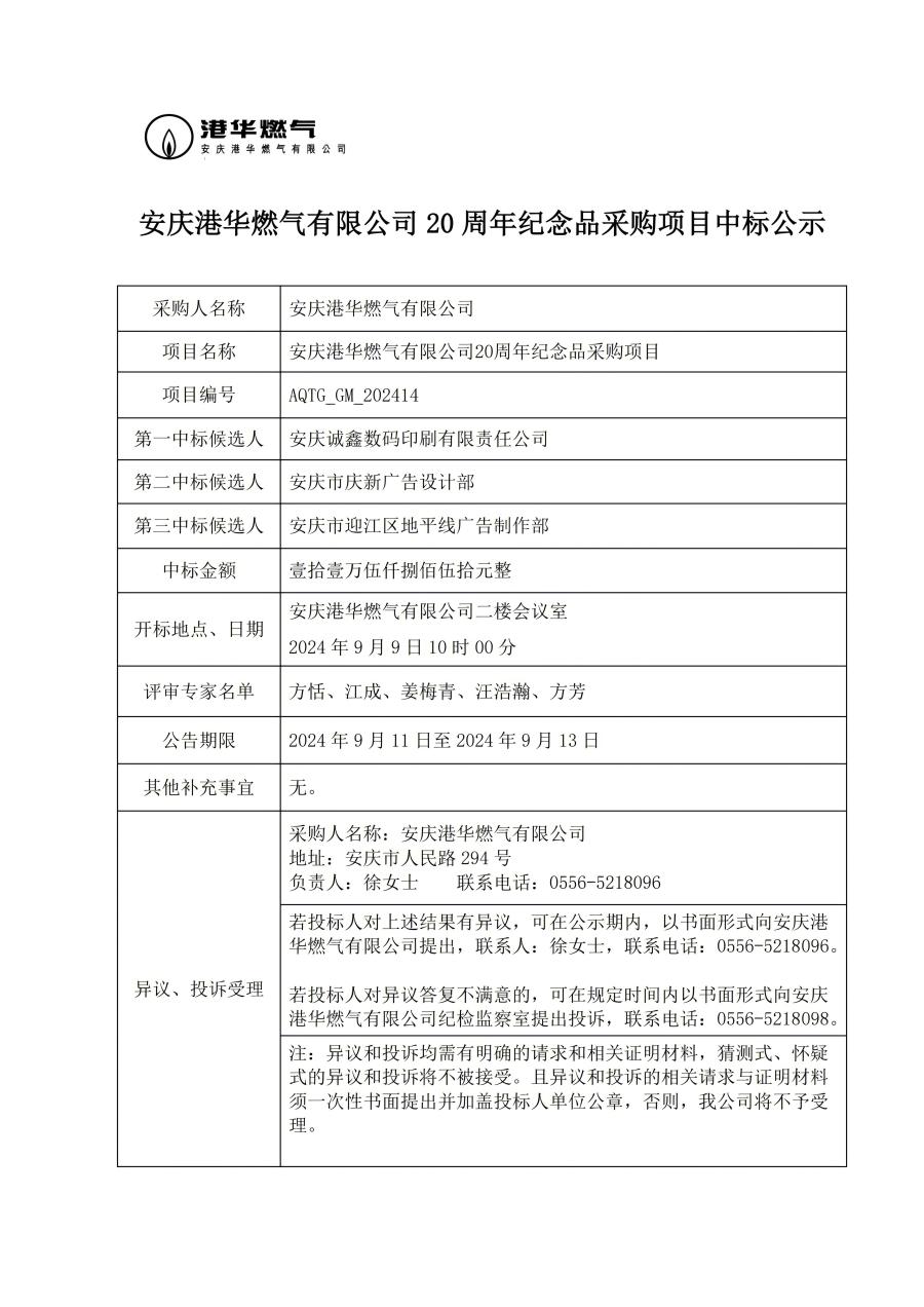 安慶港華燃?xì)庥邢薰?20 周年紀(jì)念品采購項(xiàng)目中標(biāo)公示