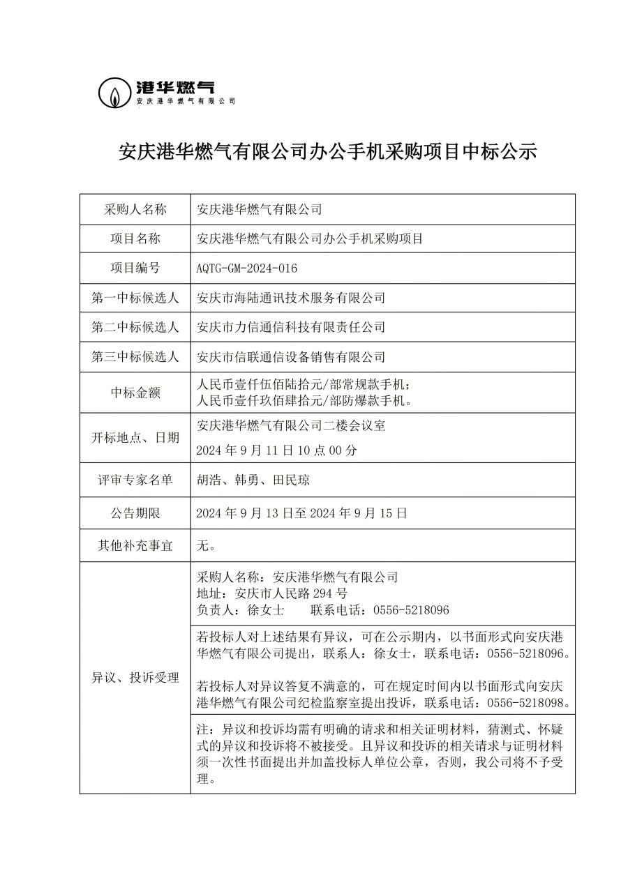 安慶港華燃?xì)庥邢薰巨k公手機(jī)采購項(xiàng)目中標(biāo)公示