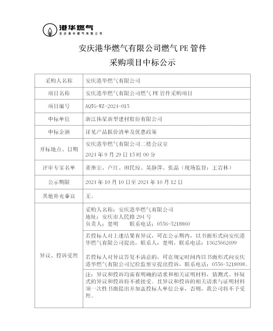 安慶港華燃?xì)庥邢薰救細(xì)釶E管件采購(gòu)項(xiàng)目中標(biāo)公示