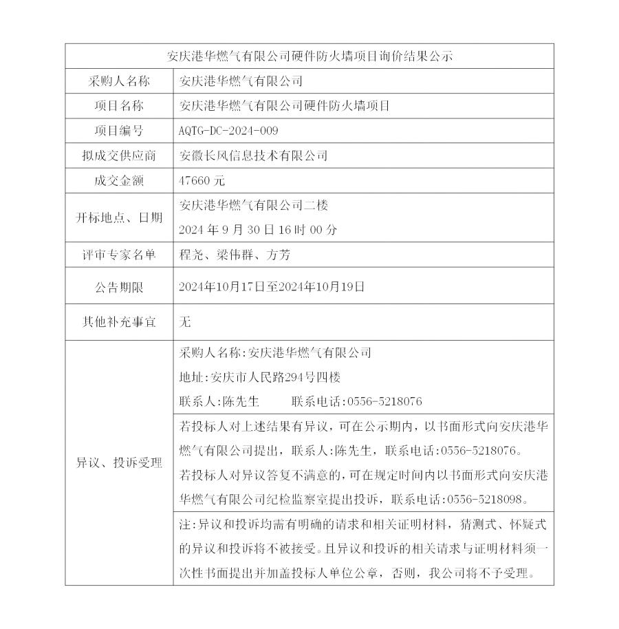 安慶港華燃氣有限公司硬件防火墻項目詢價結(jié)果公示