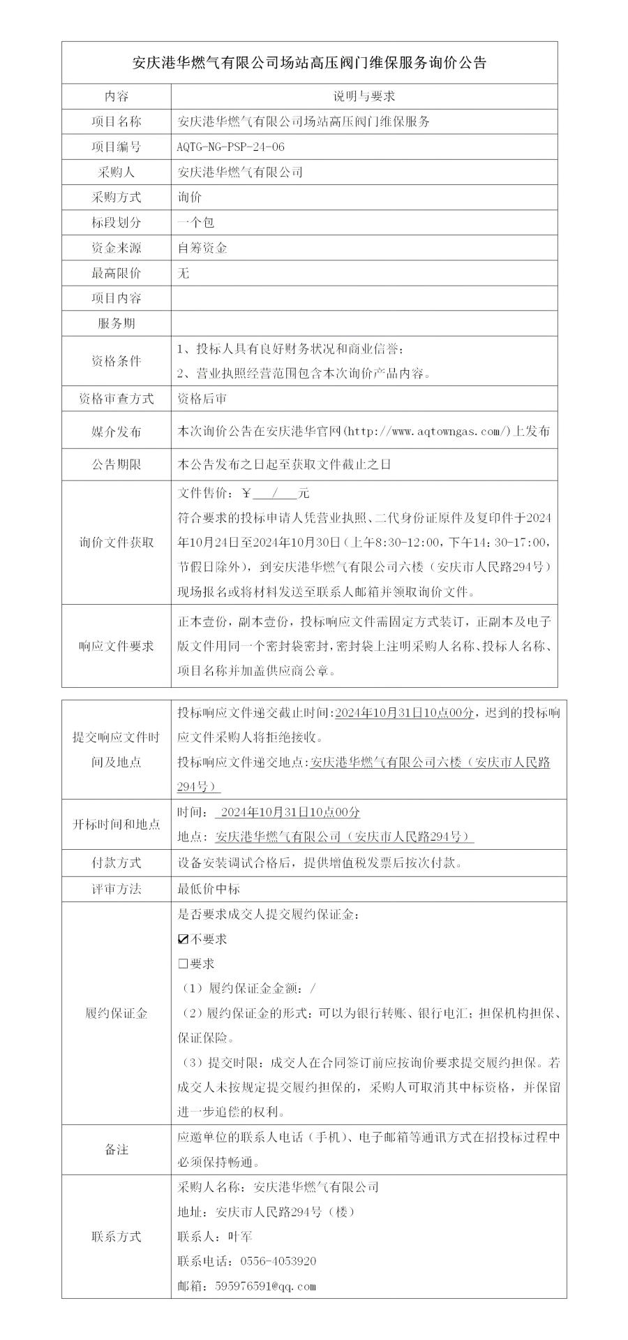 安慶港華燃氣有限公司場站高壓閥門維保服務詢價公告 發(fā)布時間:2024-10-22    閱讀次數:2962次