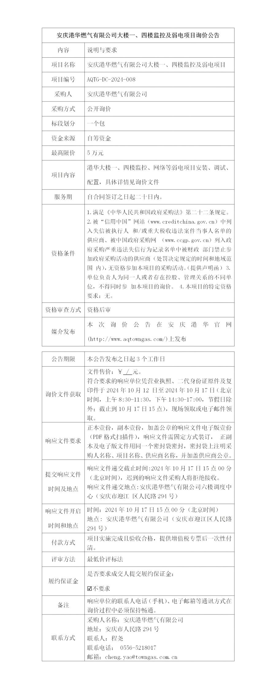 安慶港華燃?xì)庥邢薰敬髽且?、四樓監(jiān)控及弱電項(xiàng)目詢價(jià)公告