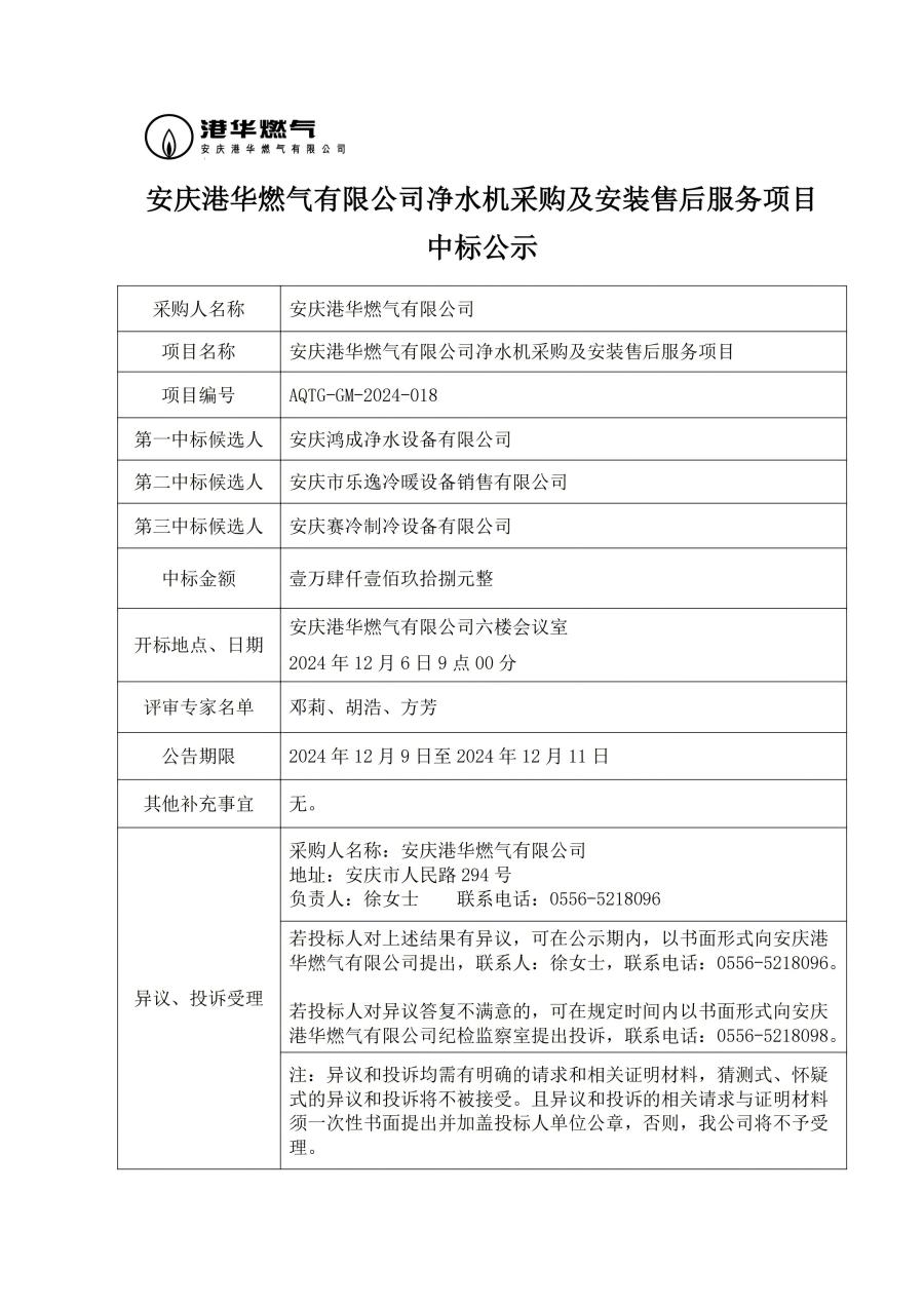 安慶港華燃氣有限公司凈水機采購及安裝售后服務項目中標公示 發(fā)布時間:2024-12-09    閱讀次數(shù):3130次