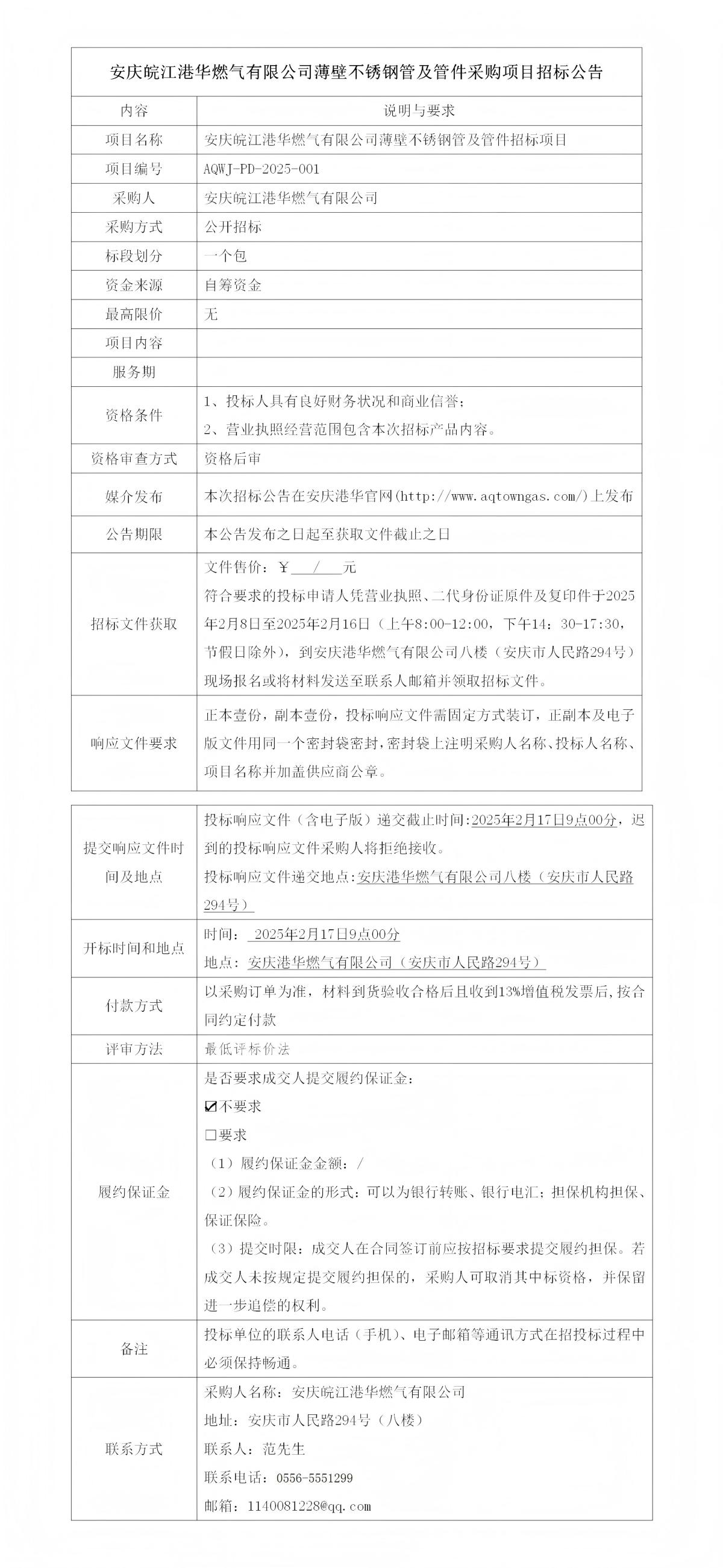 安慶皖江港華燃?xì)庥邢薰颈”诓讳P鋼管及管件采購項目招標(biāo)公告