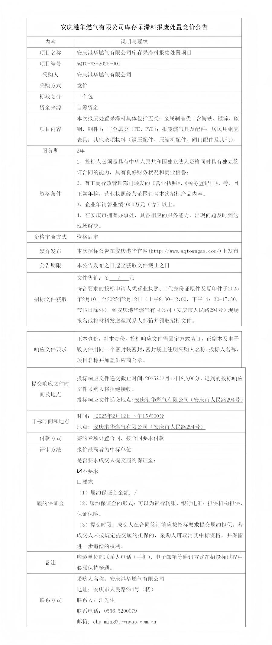 安慶港華燃?xì)庥邢薰編?kù)存呆滯料報(bào)廢處置競(jìng)價(jià)公告