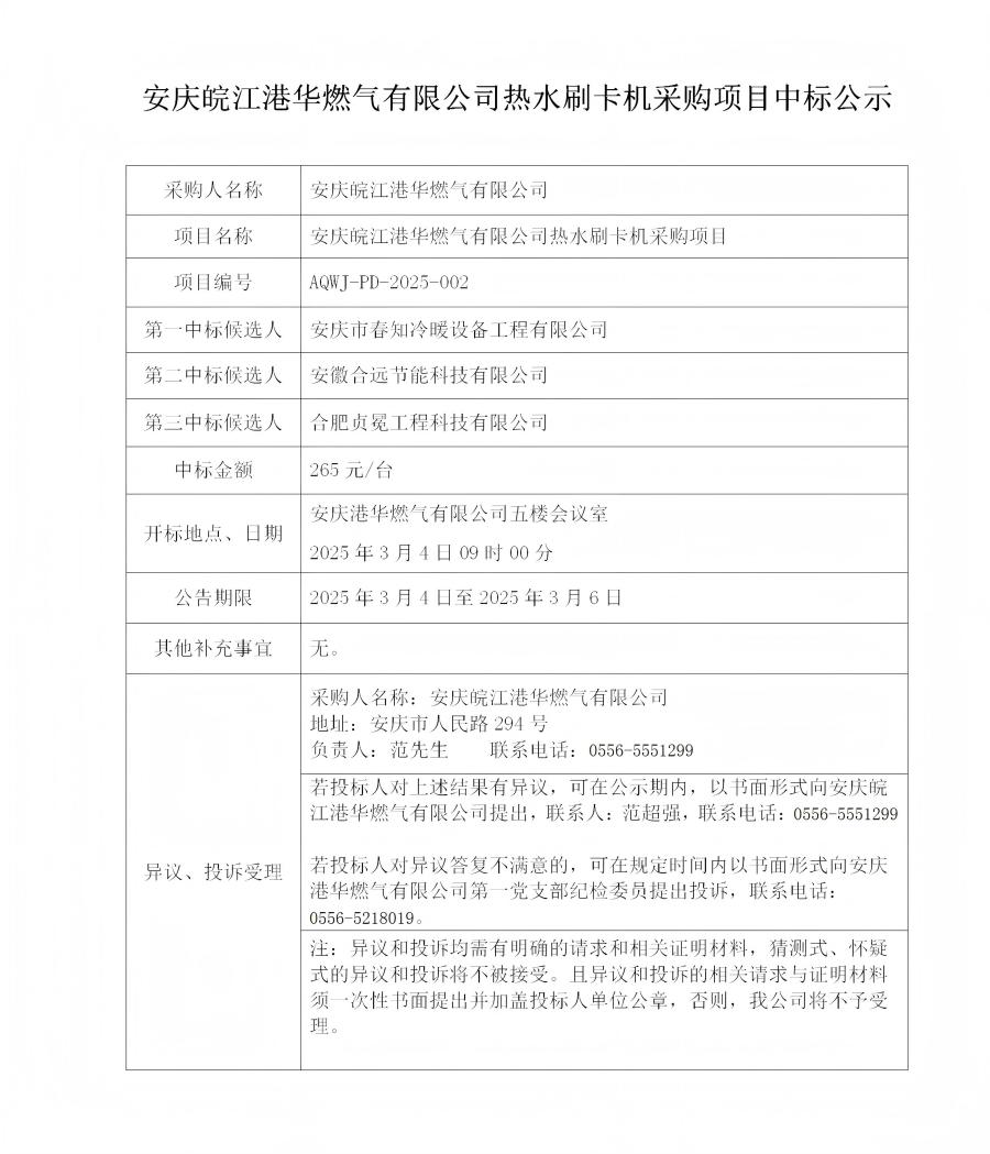 安慶皖江港華燃?xì)庥邢薰緹崴⒖C(jī)采購(gòu)項(xiàng)目中標(biāo)公示
