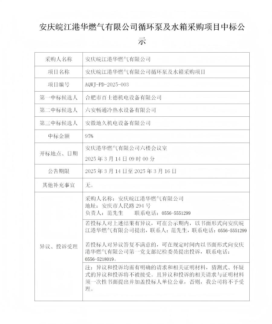 安慶皖江港華燃?xì)庥邢薰狙h(huán)泵及水箱采購項目中標(biāo)公示