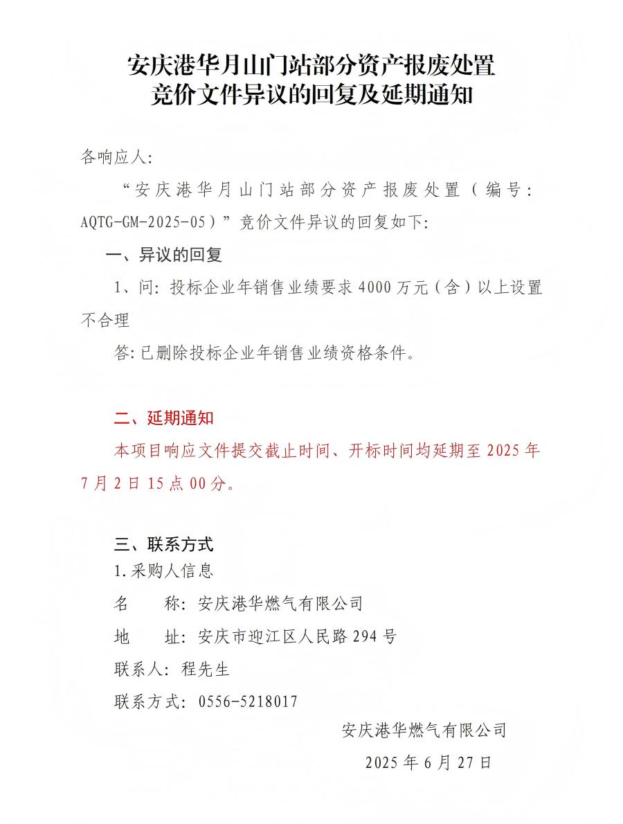 安慶港華月山門站部分資產(chǎn)報(bào)廢處置競價(jià)文件異議的回復(fù)及延期通知