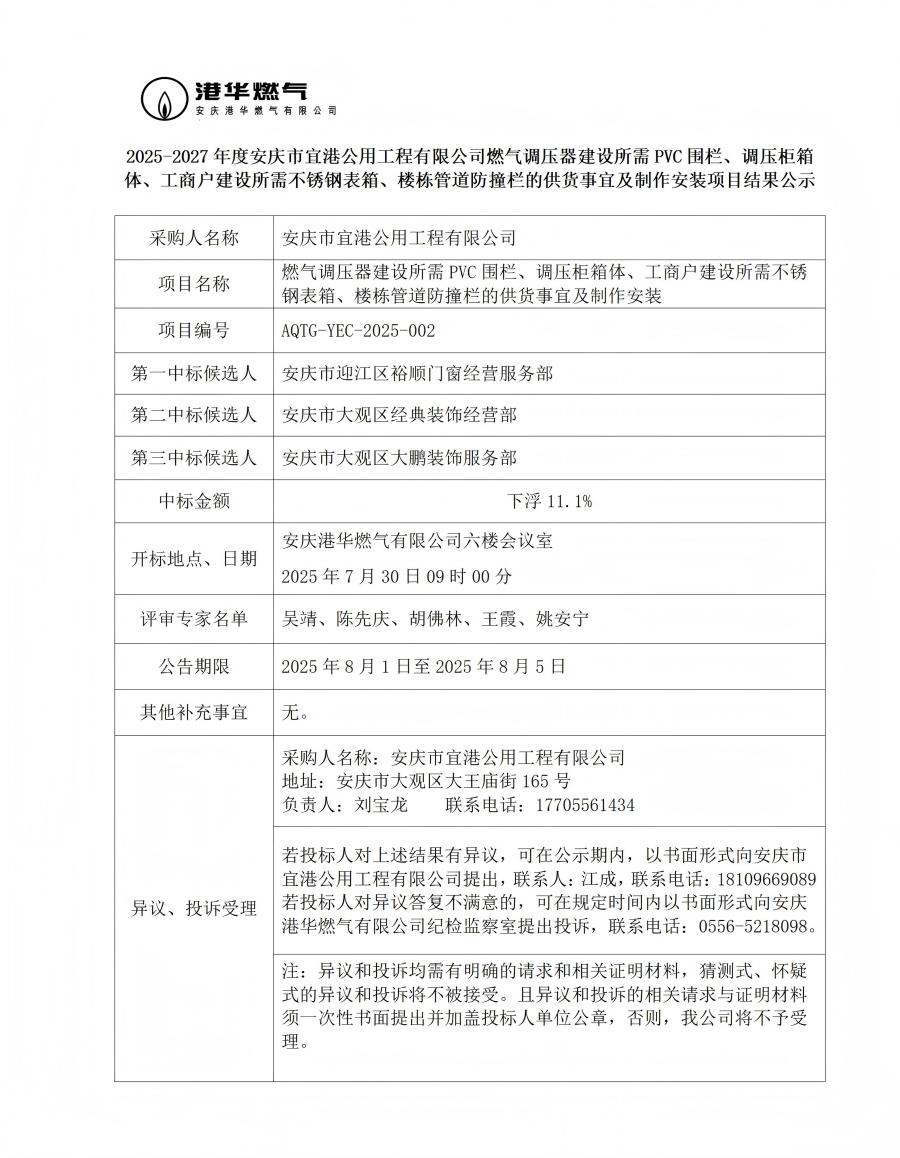 2025-2027年度安慶市宜港公用工程有限公司燃?xì)庹{(diào)壓器建設(shè)所需PVC圍欄、調(diào)壓柜箱體、工商戶建設(shè)所需不銹鋼表箱、樓棟管道防撞欄的供貨事宜及制作安裝項目結(jié)果公示