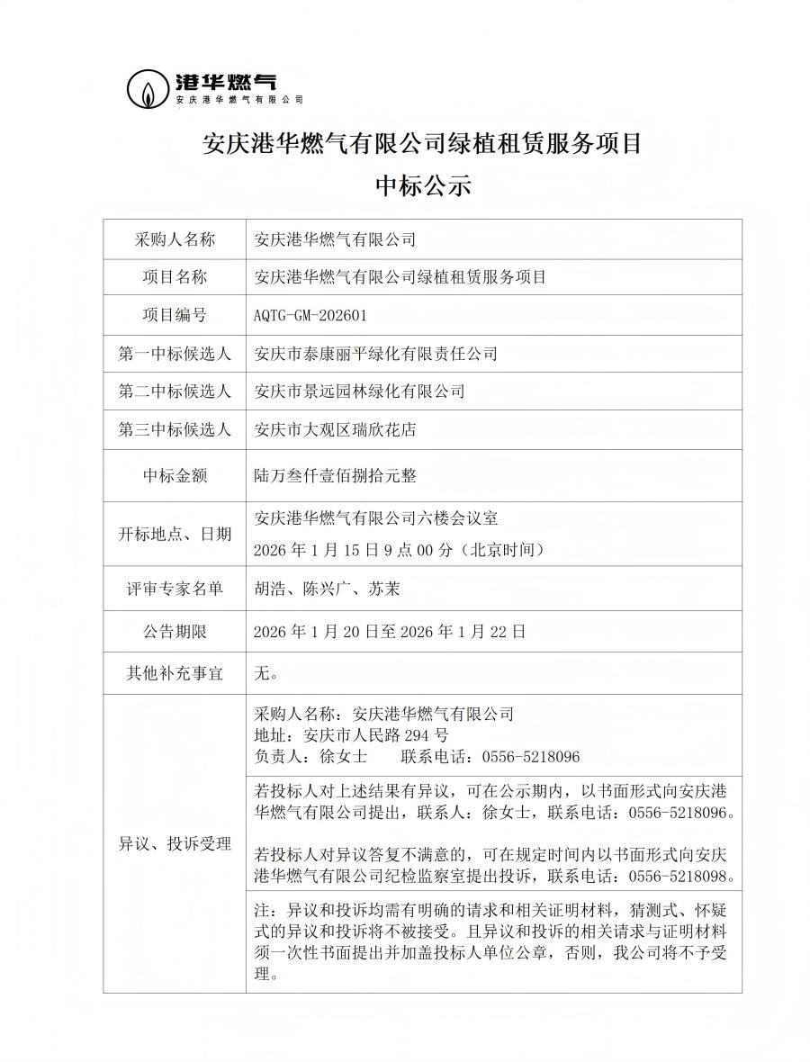 安慶港華燃氣有限公司綠植租賃服務(wù)項目中標公示 發(fā)布時間:2026-01-20    閱讀次數(shù):597次